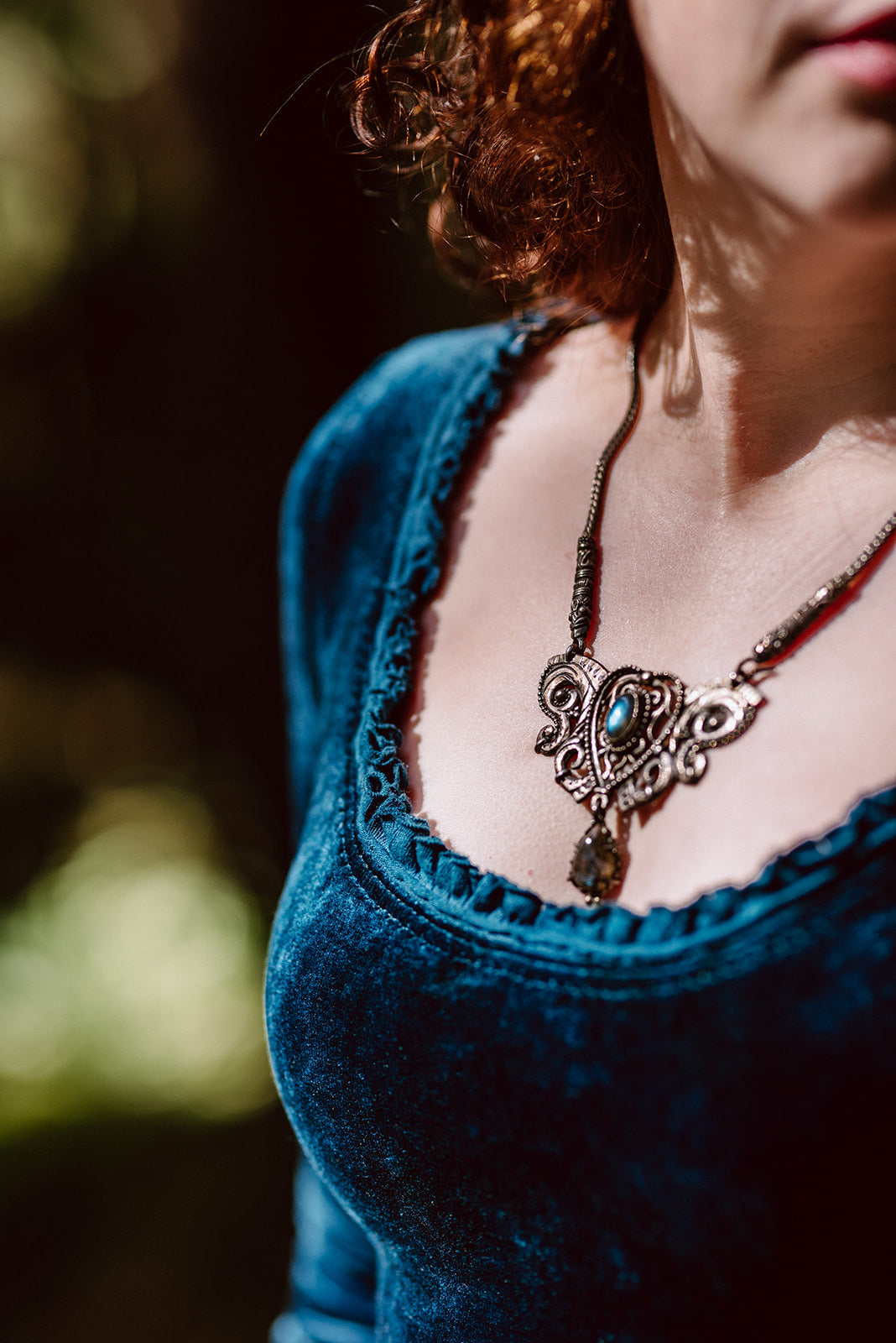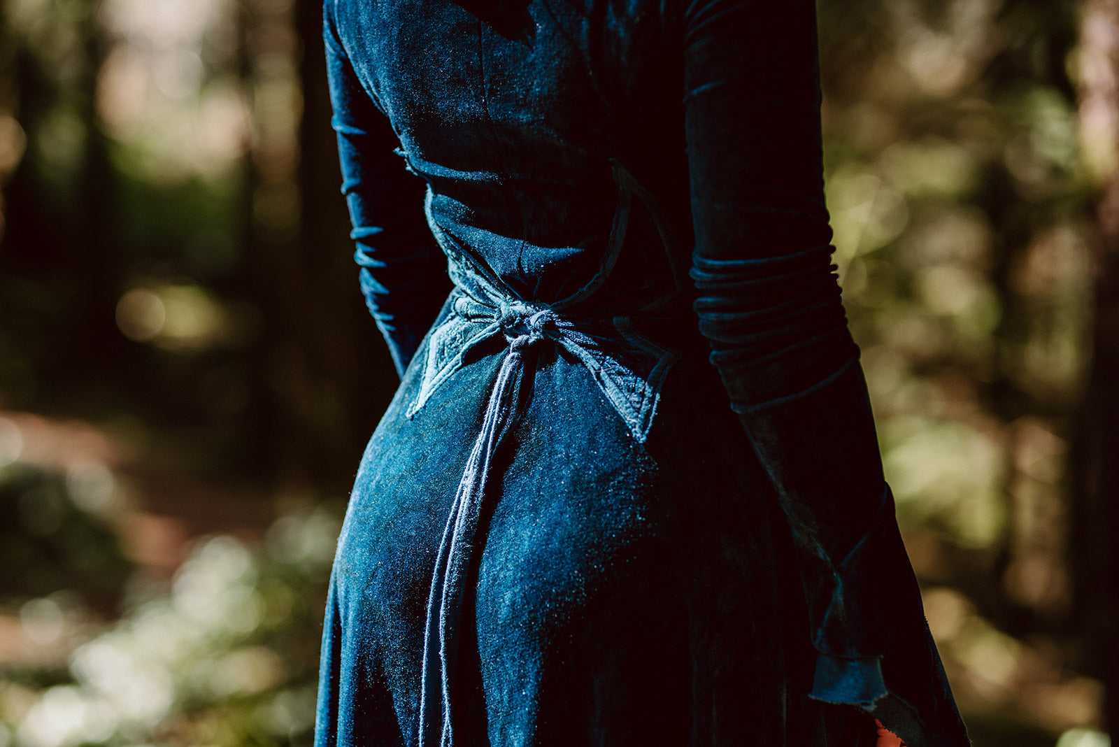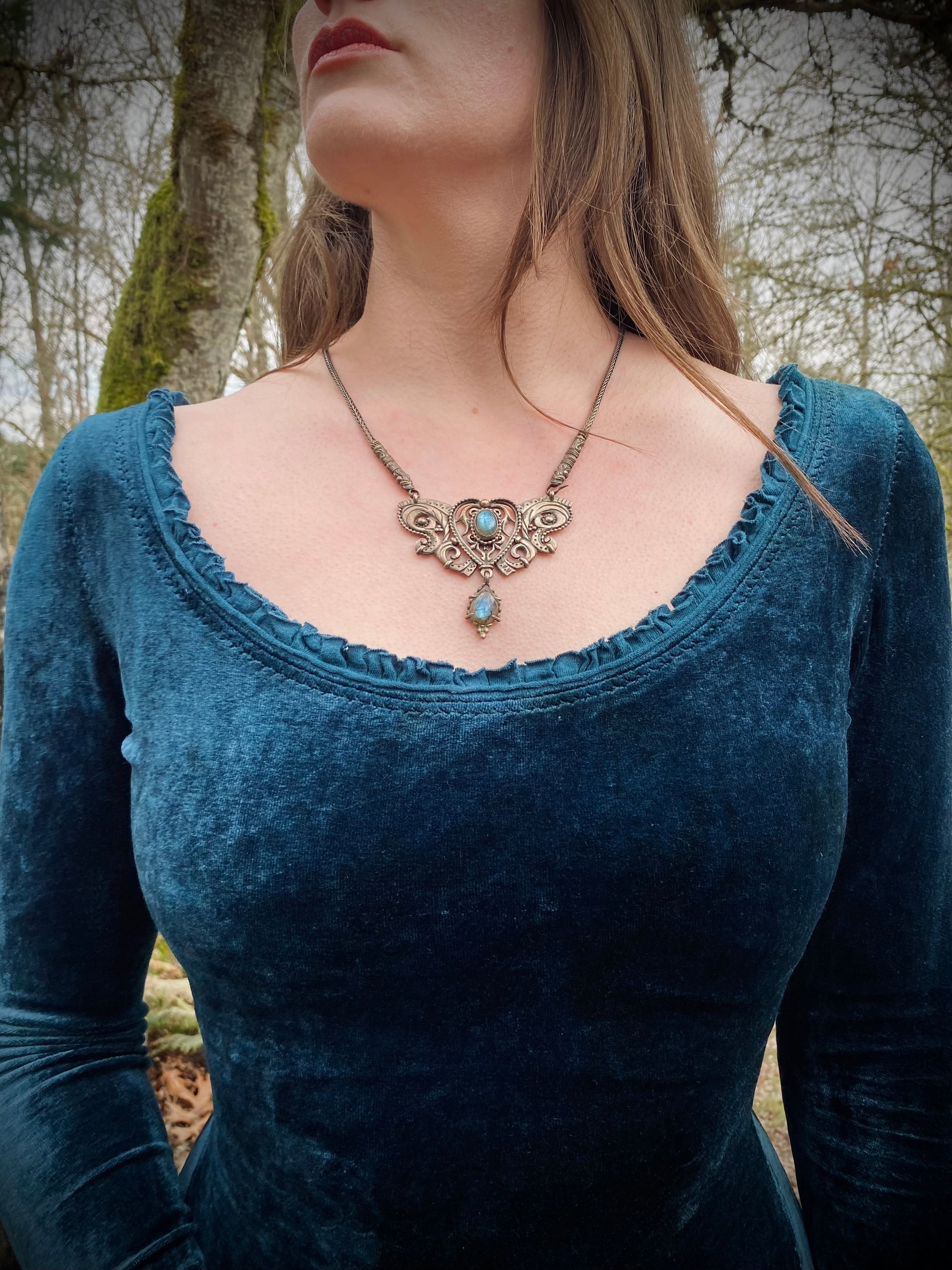 This OOAK dress is undoubtedly for a royal fae or a sorceress of the sea. Fit and flare design with topstitched side panels that hold deep pockets, long sleeves with double layered bells, butterfly shaped tie loops in the back along with an intricately sewn, extra long tie (effortless look, maximum effort), and a wide scooped neck trimmed with a gorgeous, fine pleated ruffle and an embroidery around the neckline, finished off with a delicate rolled hem.