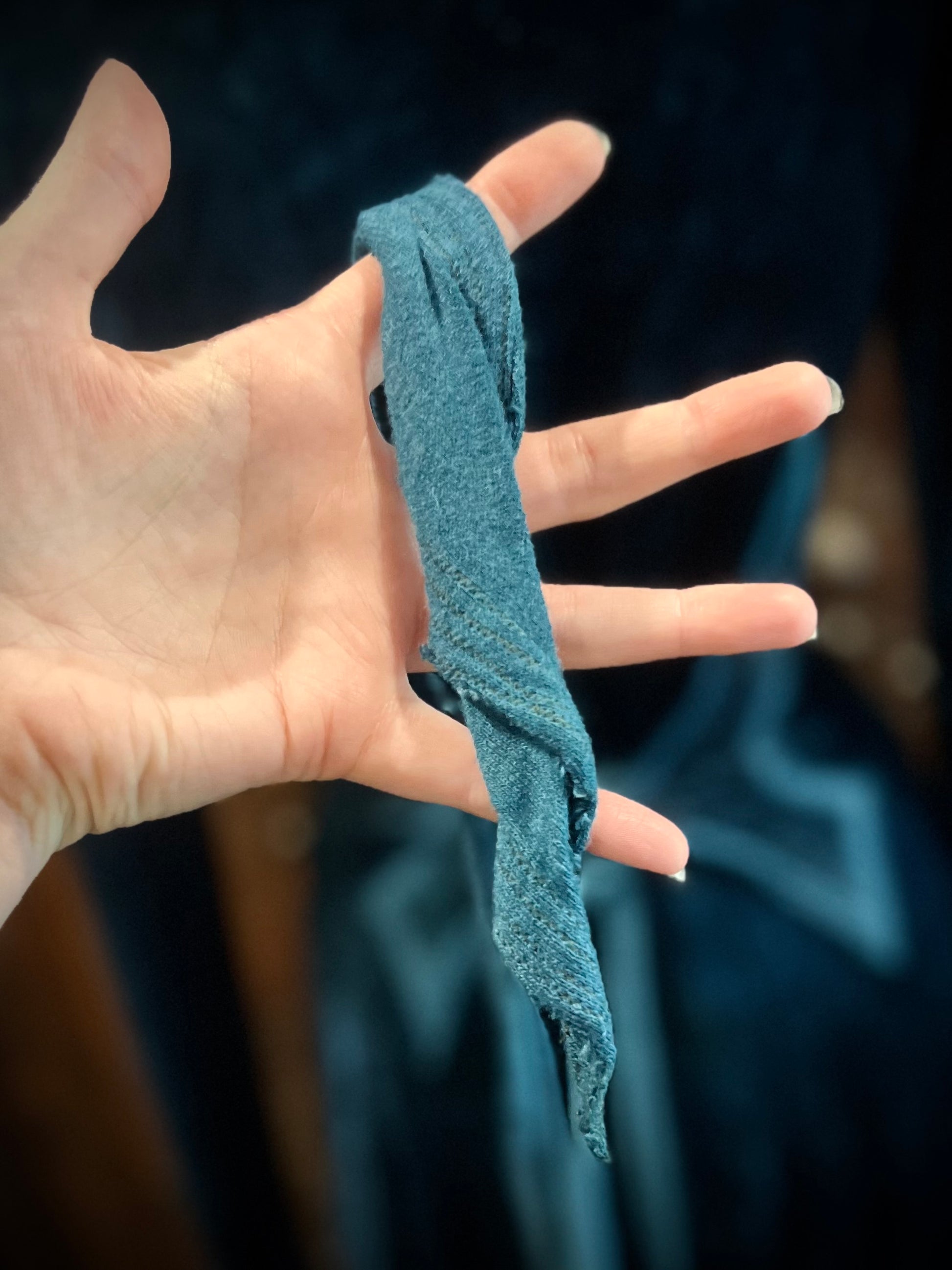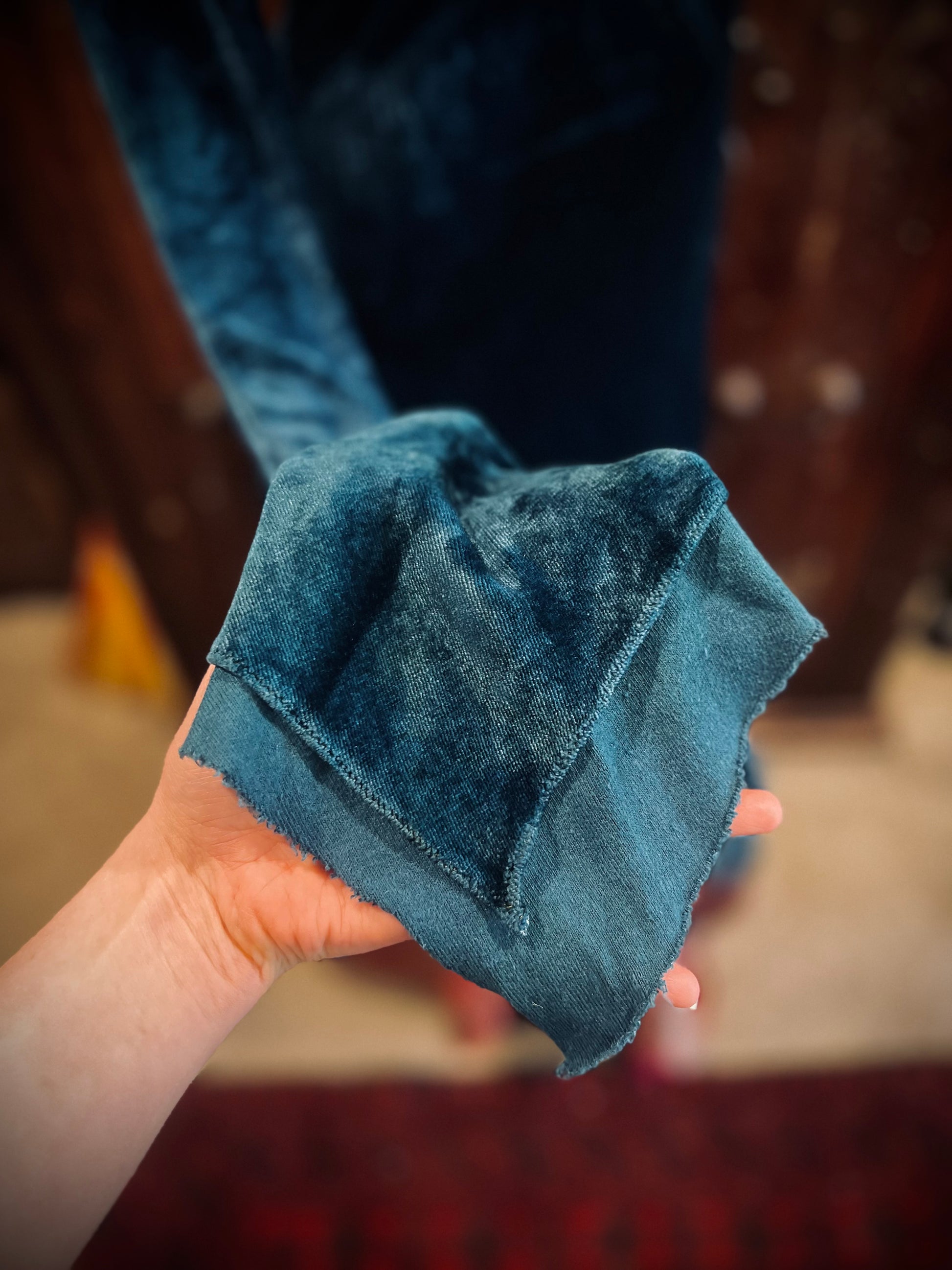 Care and feeding: Wash gently, hang dry, fluff in drier on low temperature. Best to wash with dark colors, just in case it bleeds. If the raw edges on the trim or under layer of the bell sleeves get any fly away threads that are too long, go ahead and snip them off.
