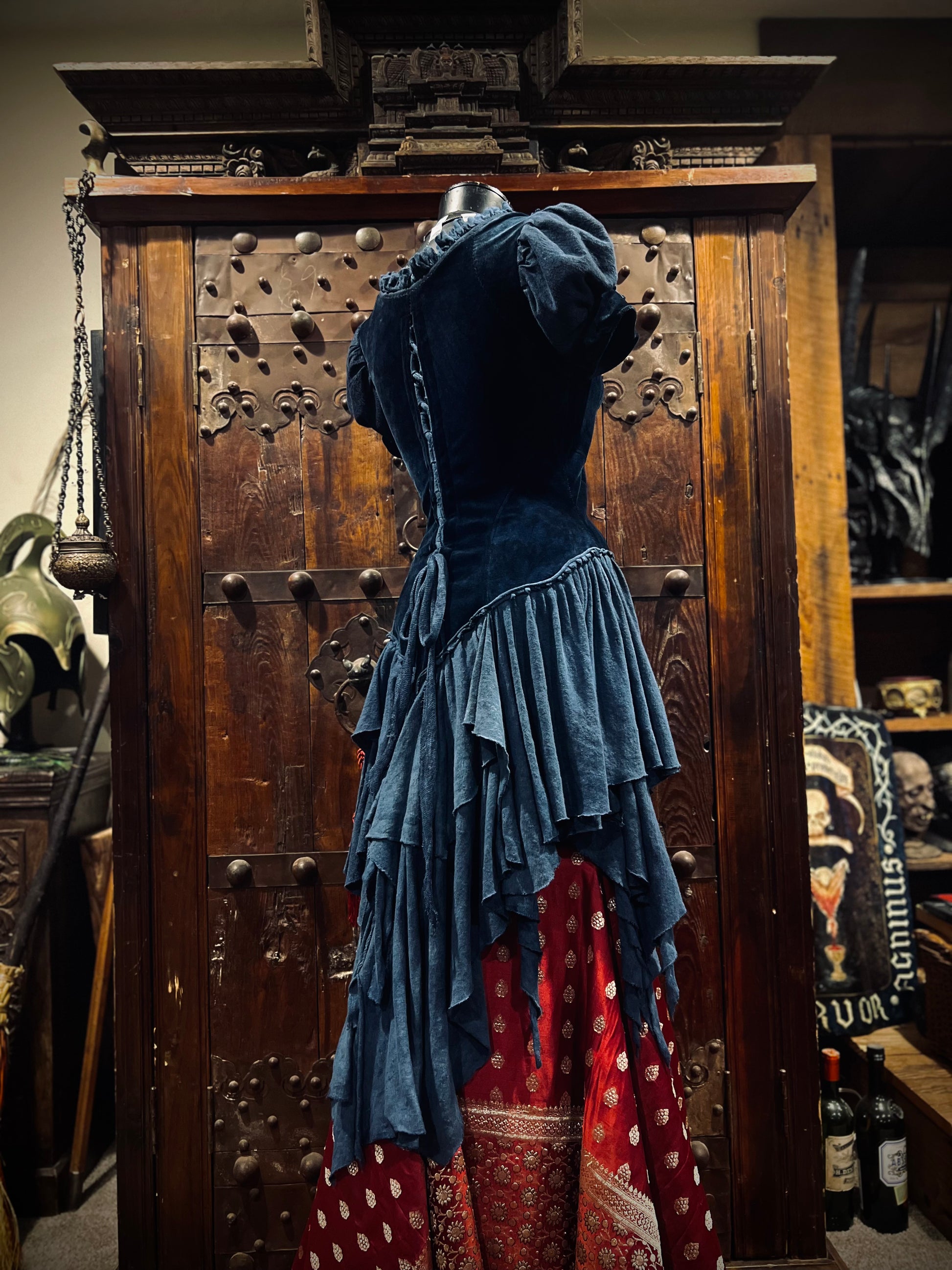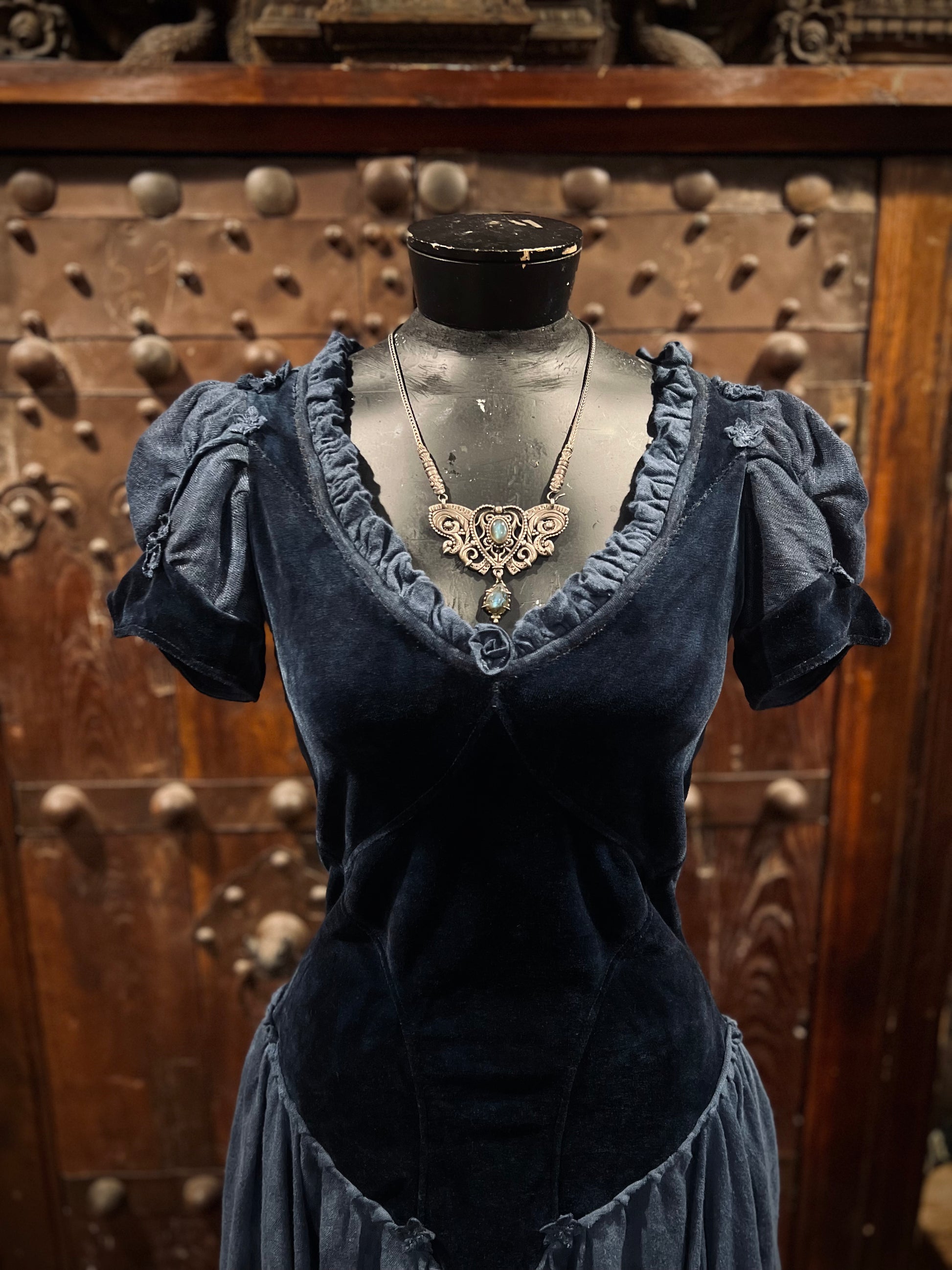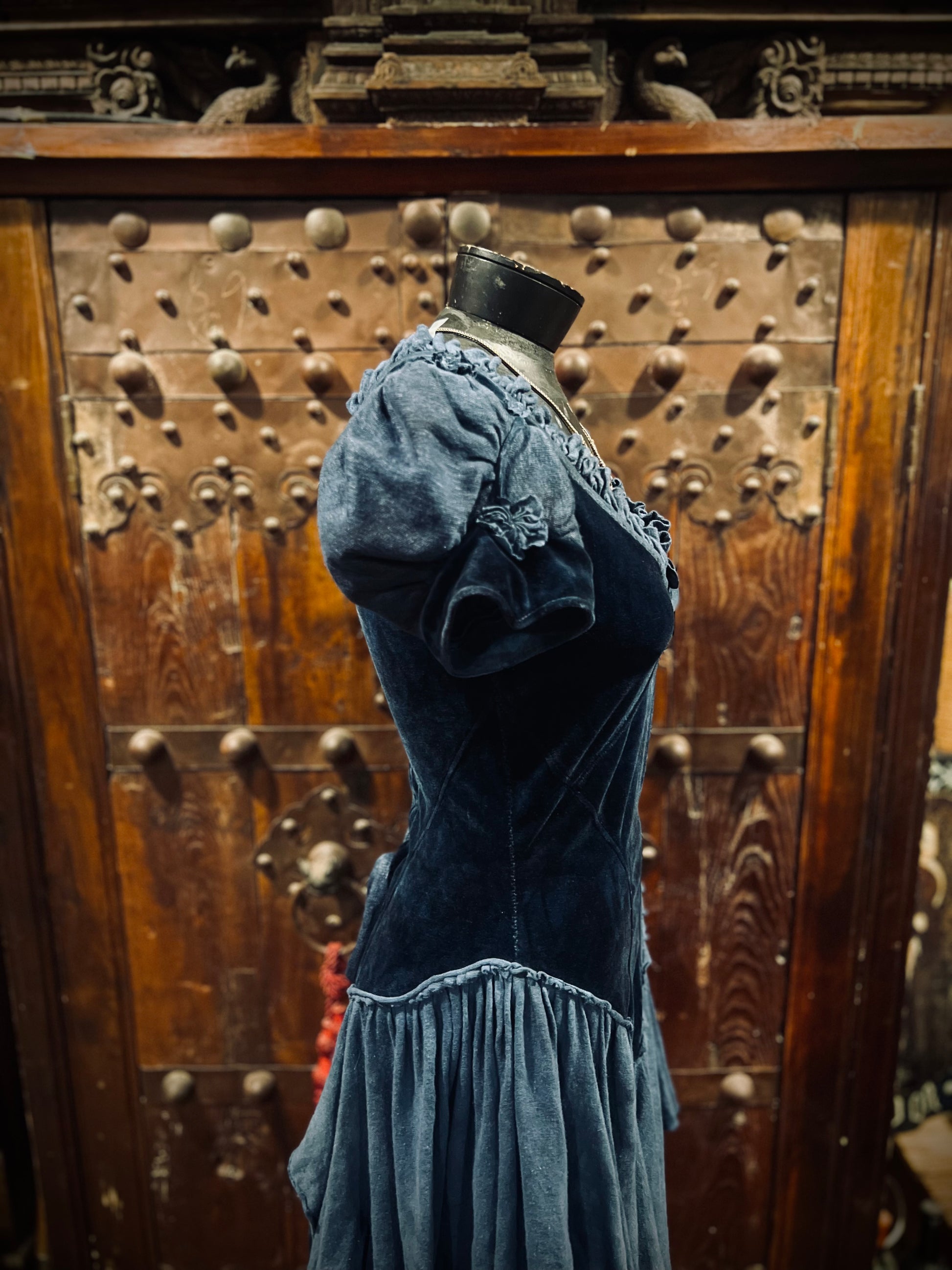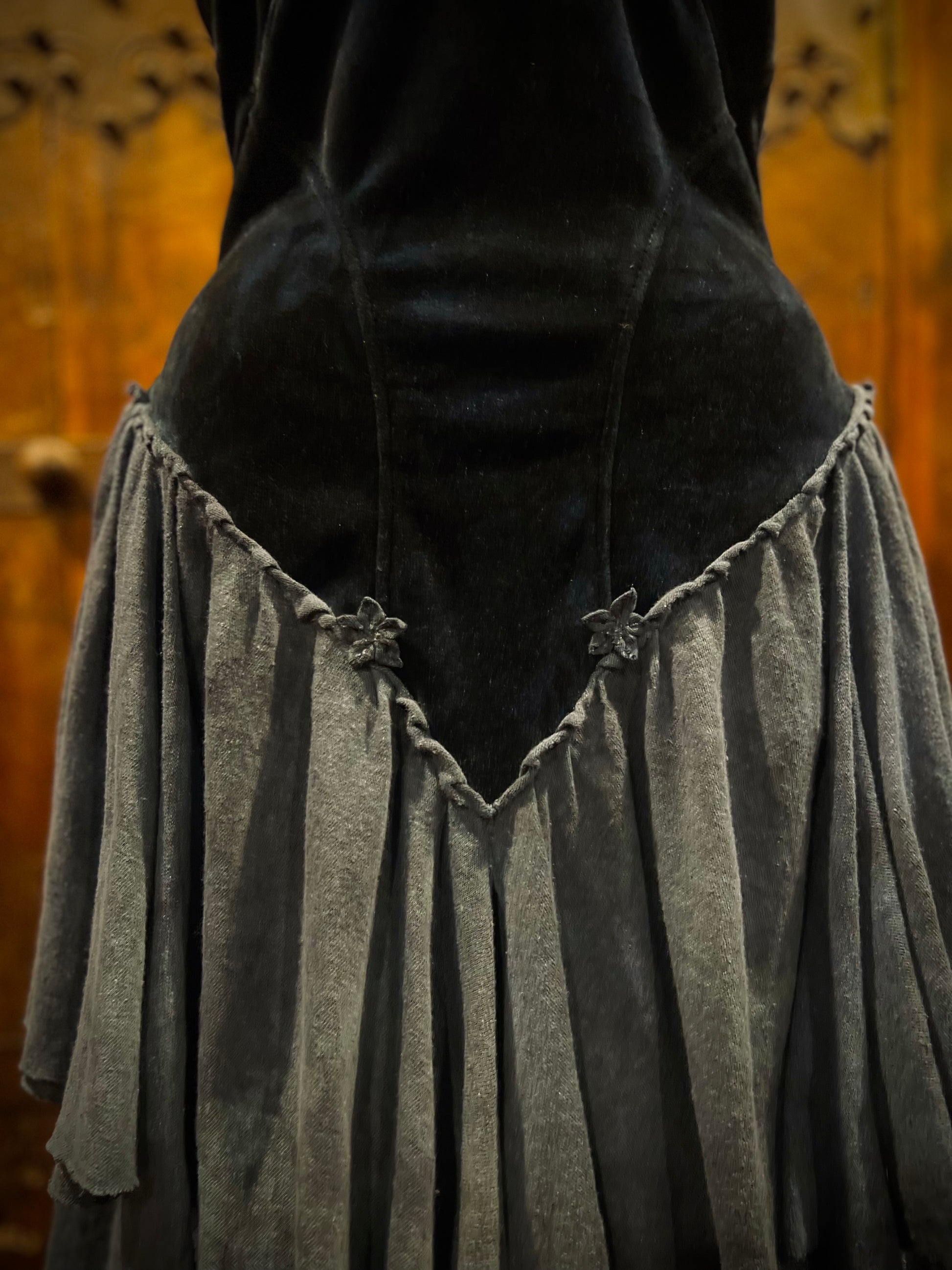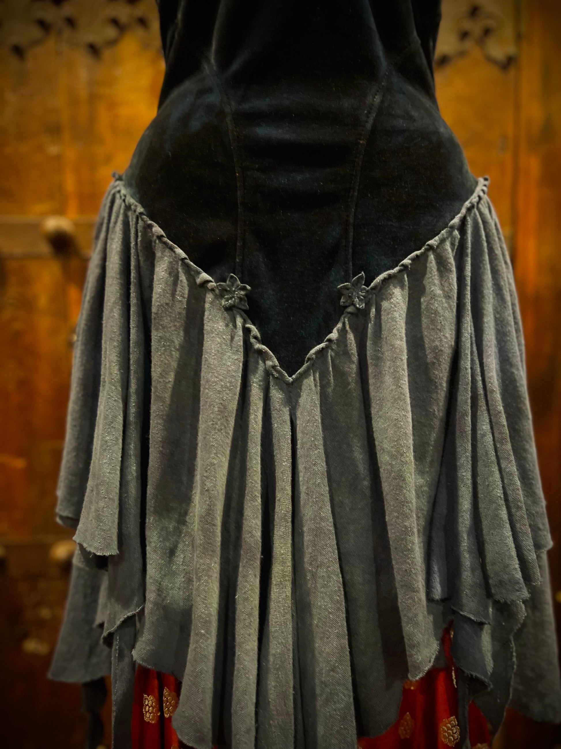 What a stunner! Fit for a princess indeed. Bodice is composed of unique topstitched seams complement the body and provide a curve hugging fit. Double layered puffy sleeves with velour piping and pointed cuffs. Neckline ruffle with embroidery stitching. Laces up the back with a matching linen knit ribbon. Finely, hand pleated layered skirt with overlapping panels (eight total!). Lastly, intricately hand made flowers (Each petal is cut and gathered separately) on the neckline, sleeves, and hem dyed to match the dress on the neckline and cuffs. Truly OOAK.