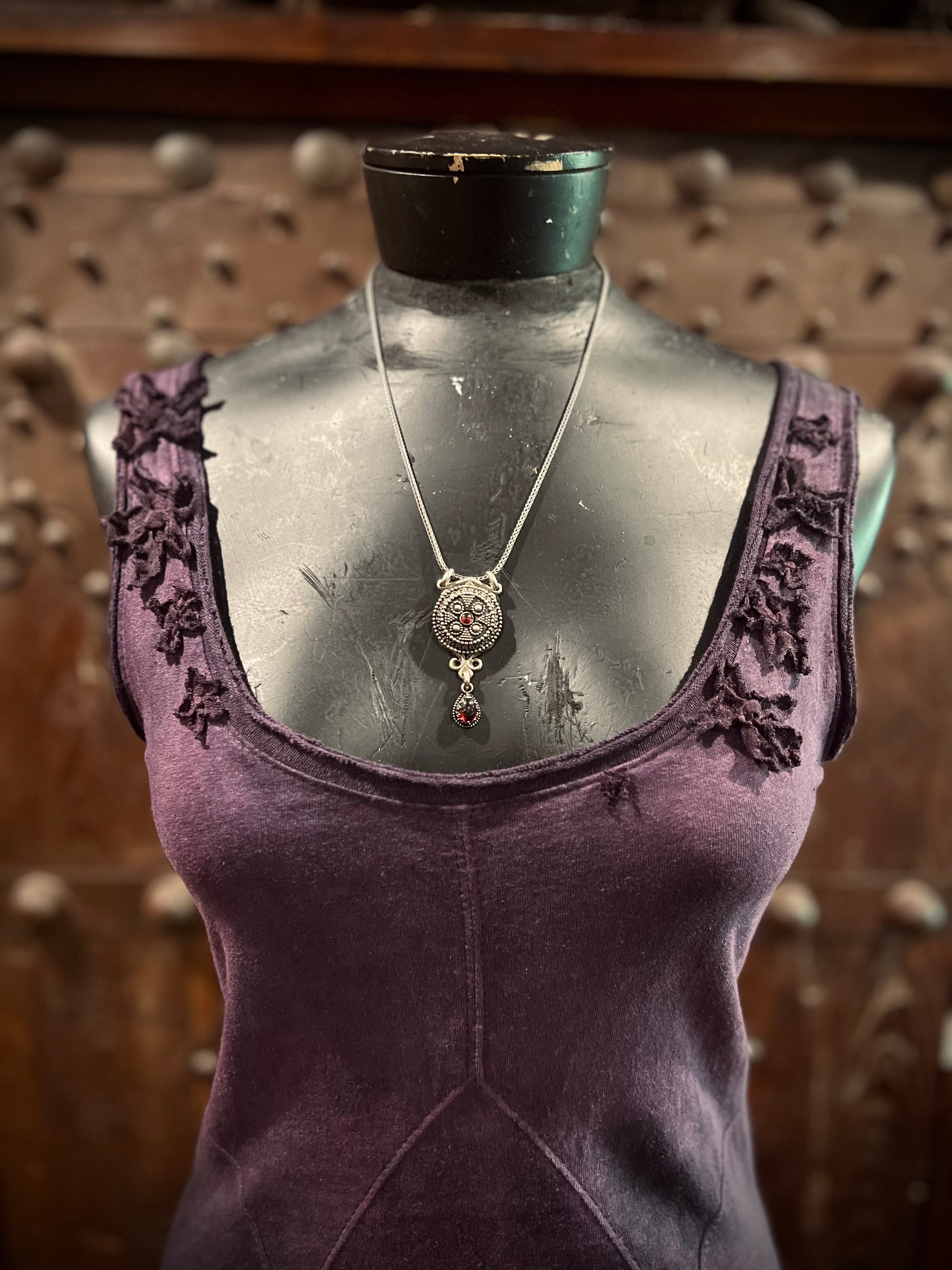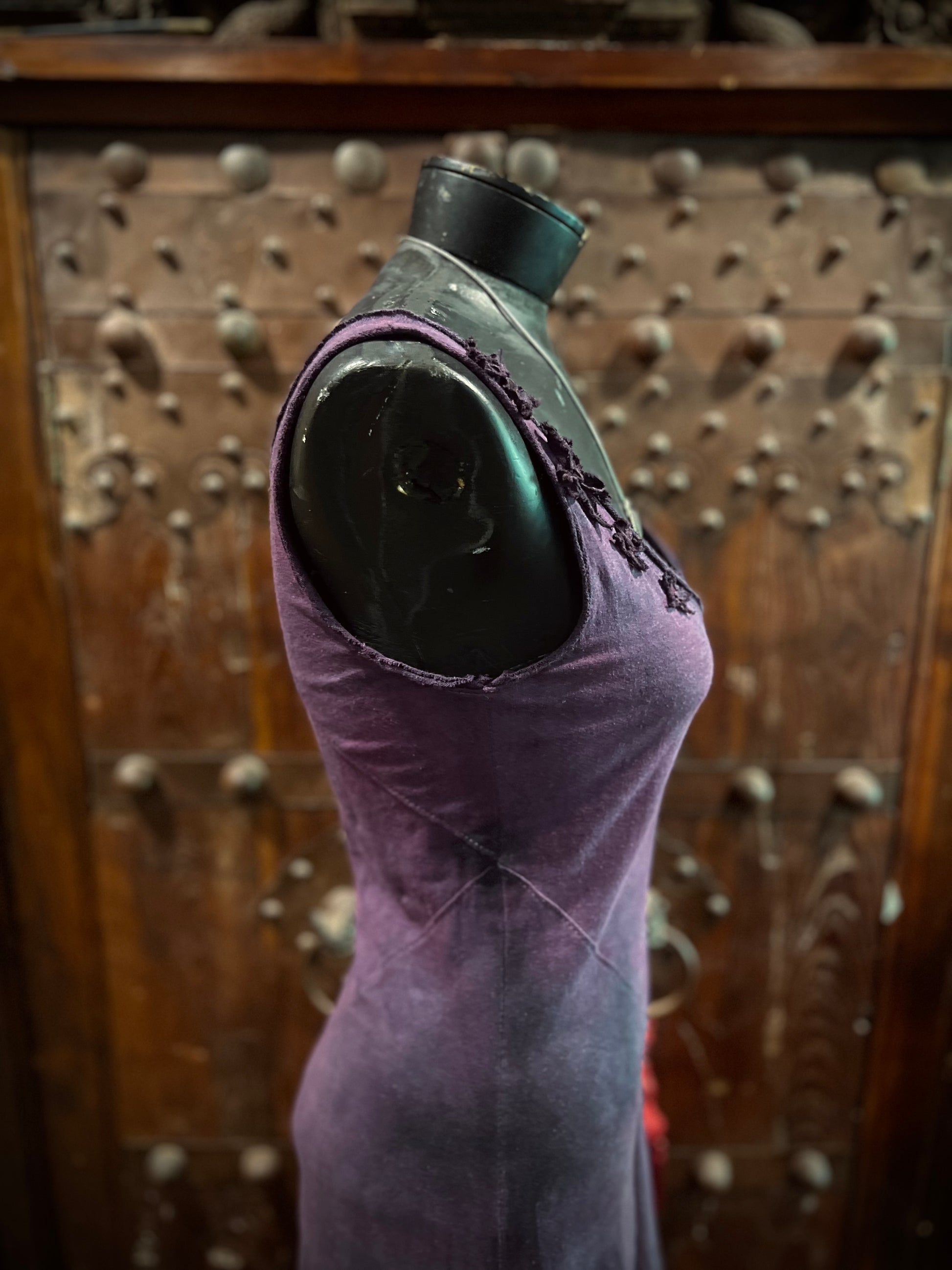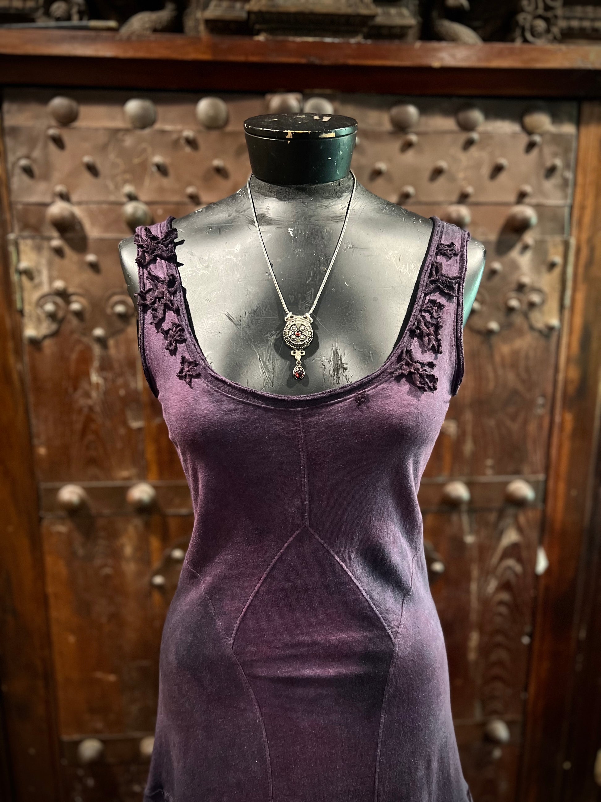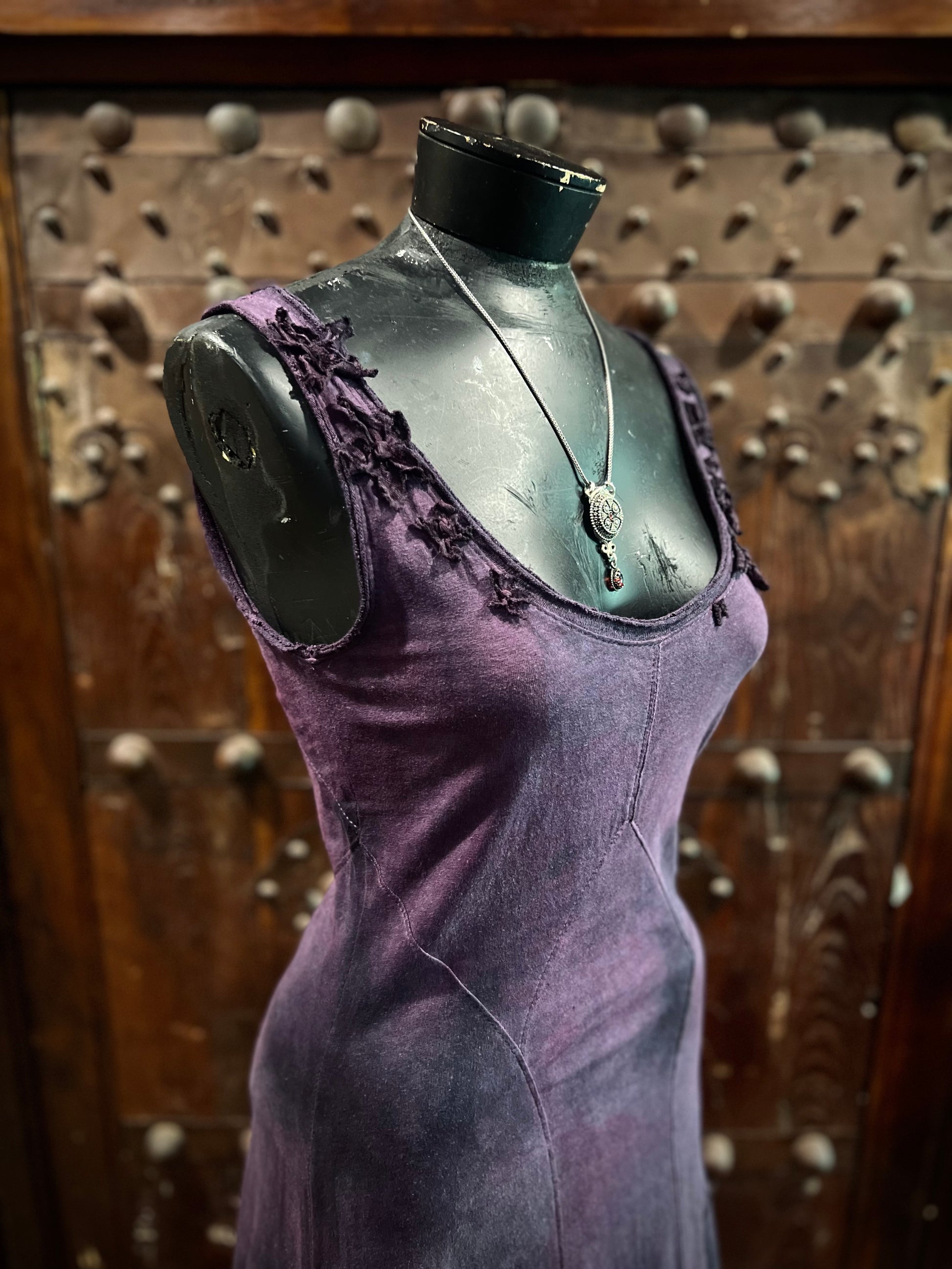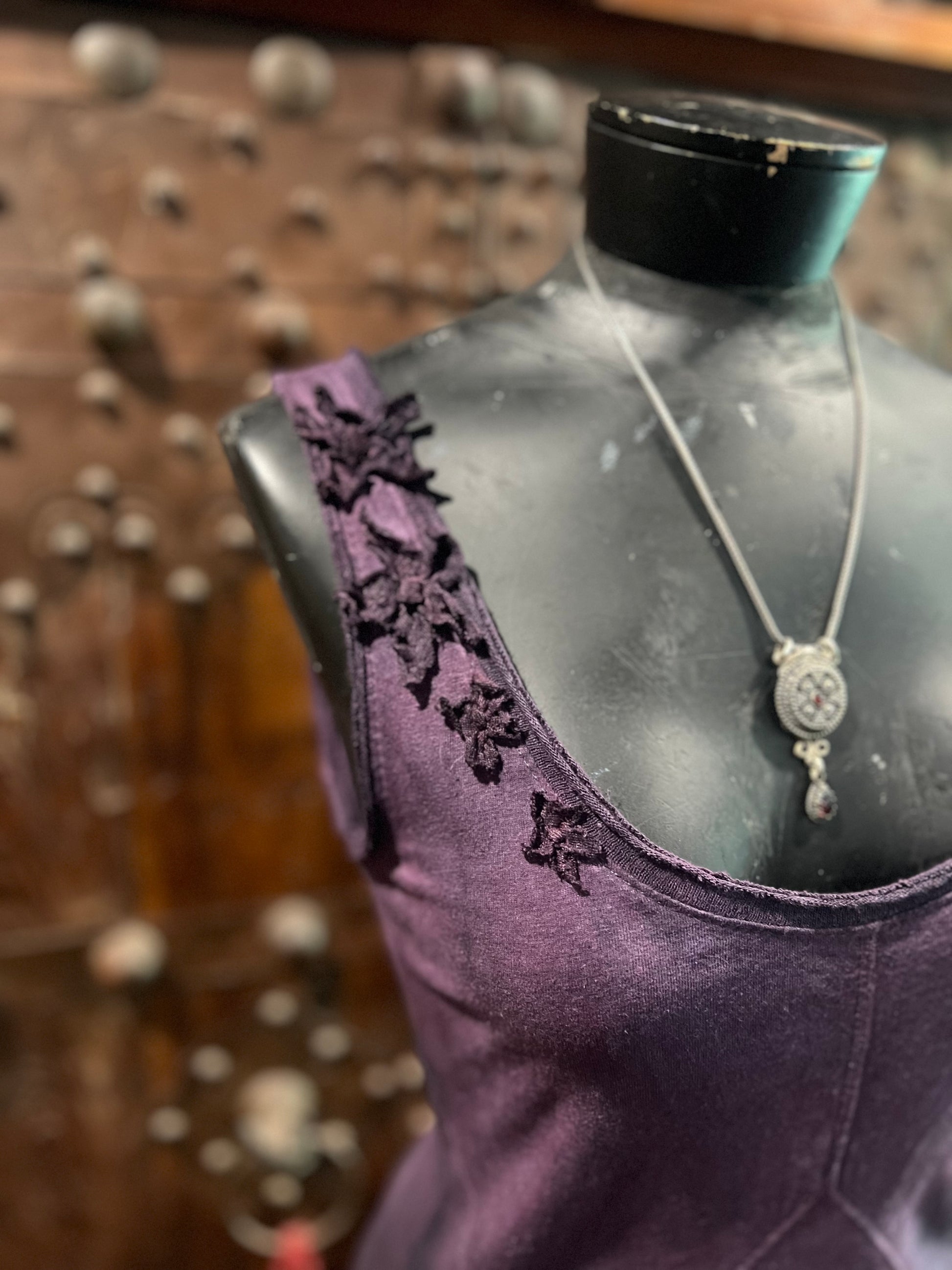 Unabashedly dark forest fashion loosely inspired by 1920s flapper dresses but with a curve hugging fit and elven lines. Body has unique, topstitched seam lines to flatter the form. The skirt has multiple layers and creates fun, insect like flutters. The neckline is adorned by scattered little linen knit flowers, all carefully cut, gathered, and sewn on by hand.