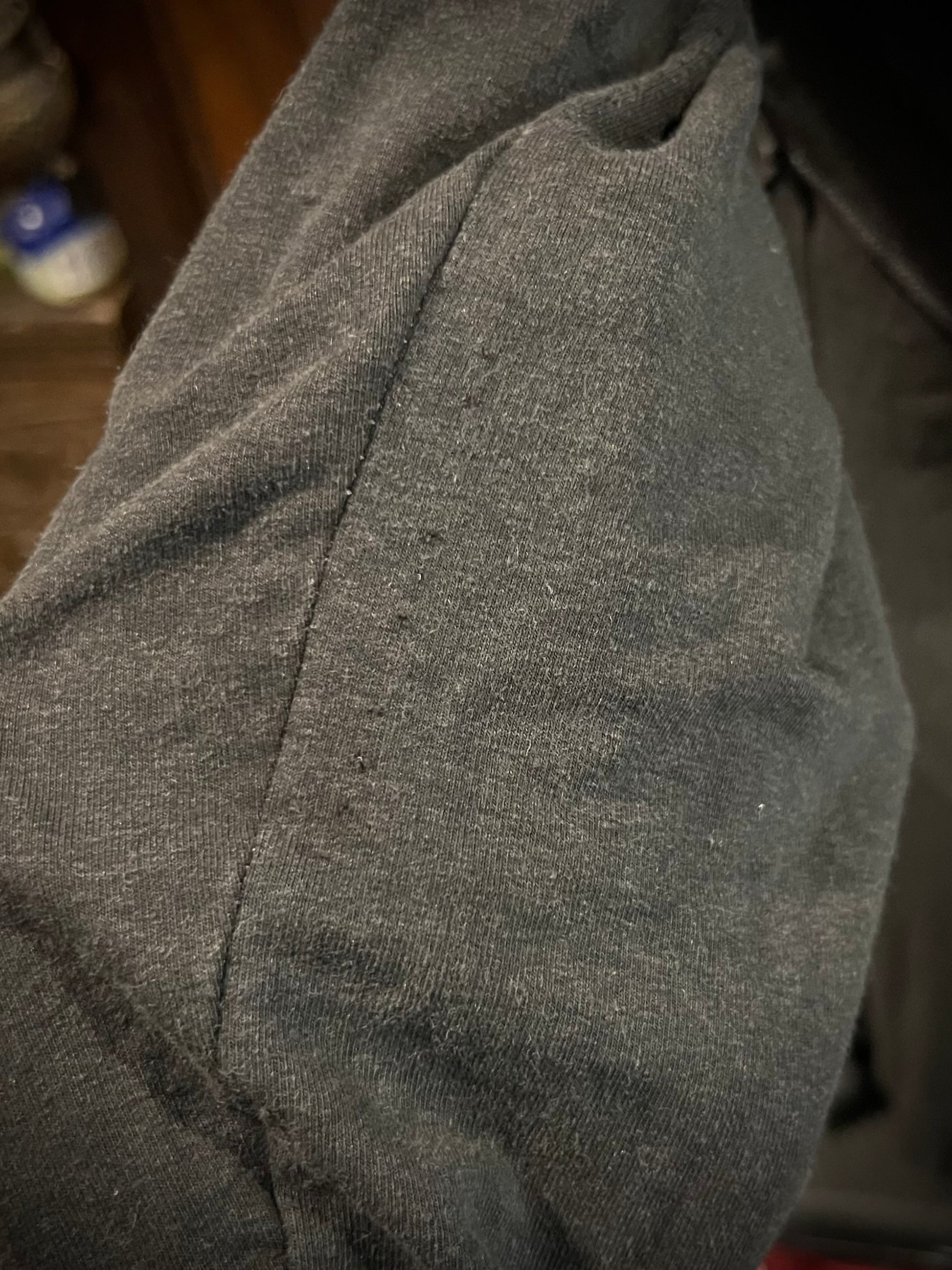 Flaw: Sleeve has tiny pin holes from the fabric manufacturer about a half inch away from the seam. Hard to spot - I hadn’t even noticed them until after the garment was completed. See last photo.