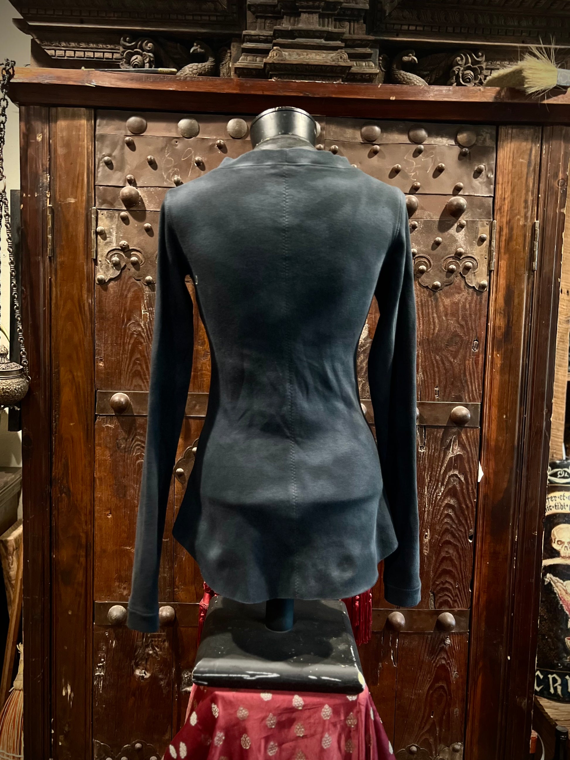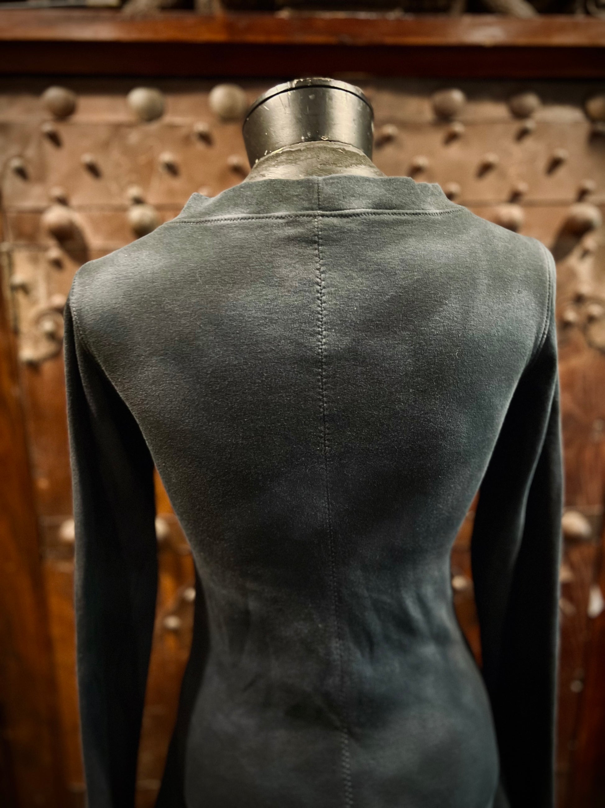 This cozy tunic is a deviation from my current obsession with elaborate, feminine pieces. Accommodates curves but guys have tried on this design and it works beautifully on them, making it more of a unisex style. Made from a sturdy, cozy organic cotton/bamboo stretch interlock and dyed a yummy blueish dark gray.