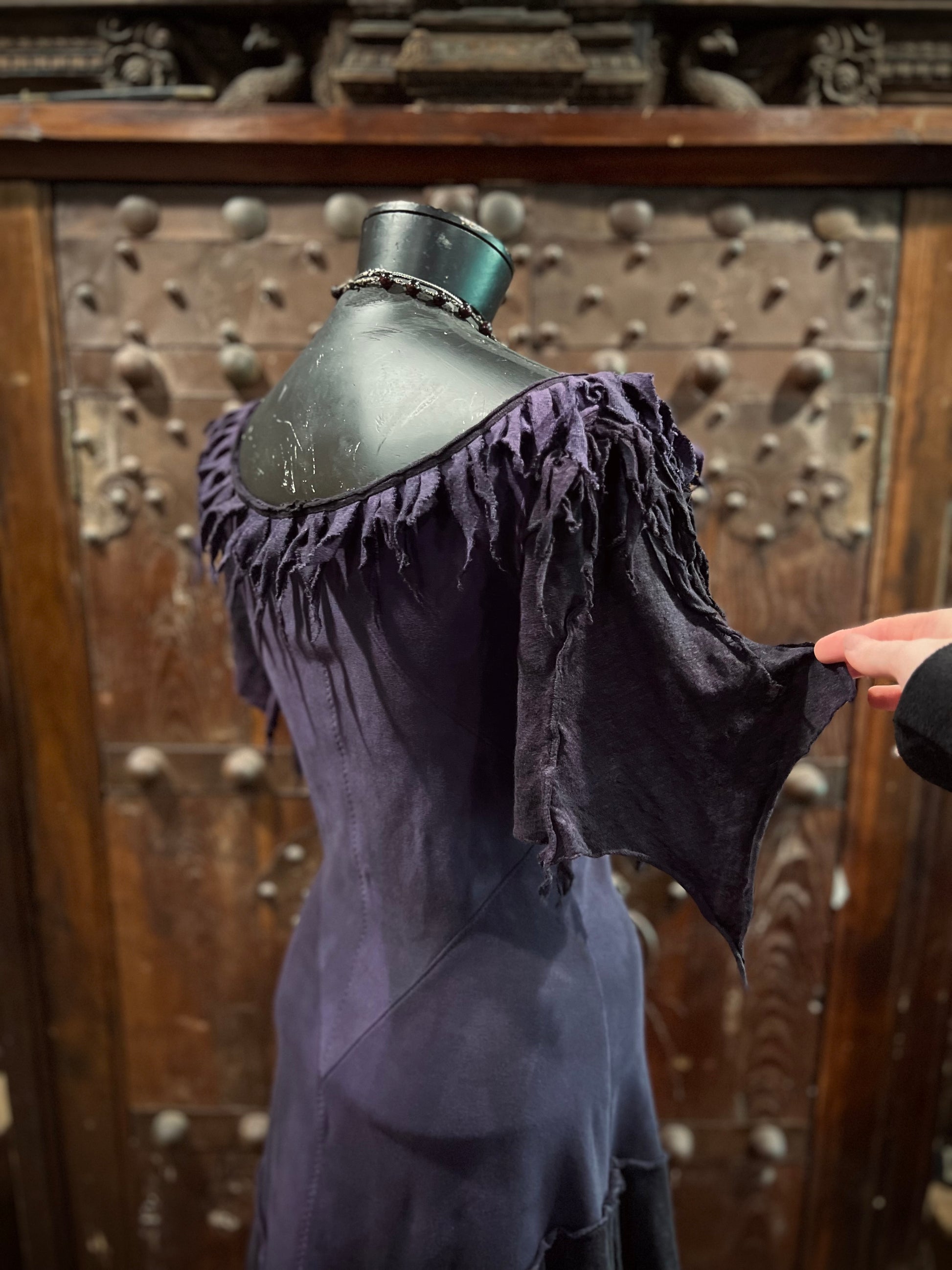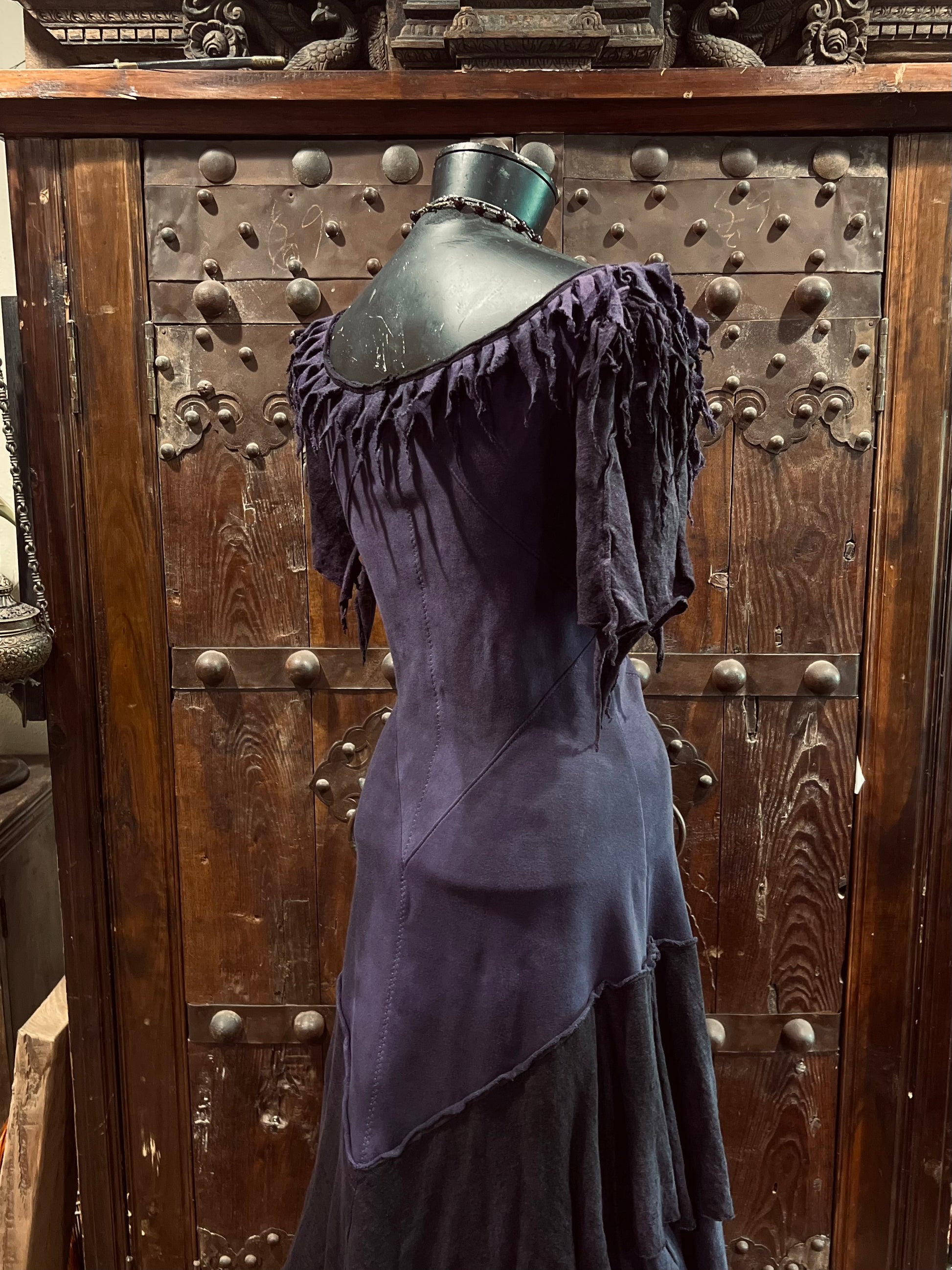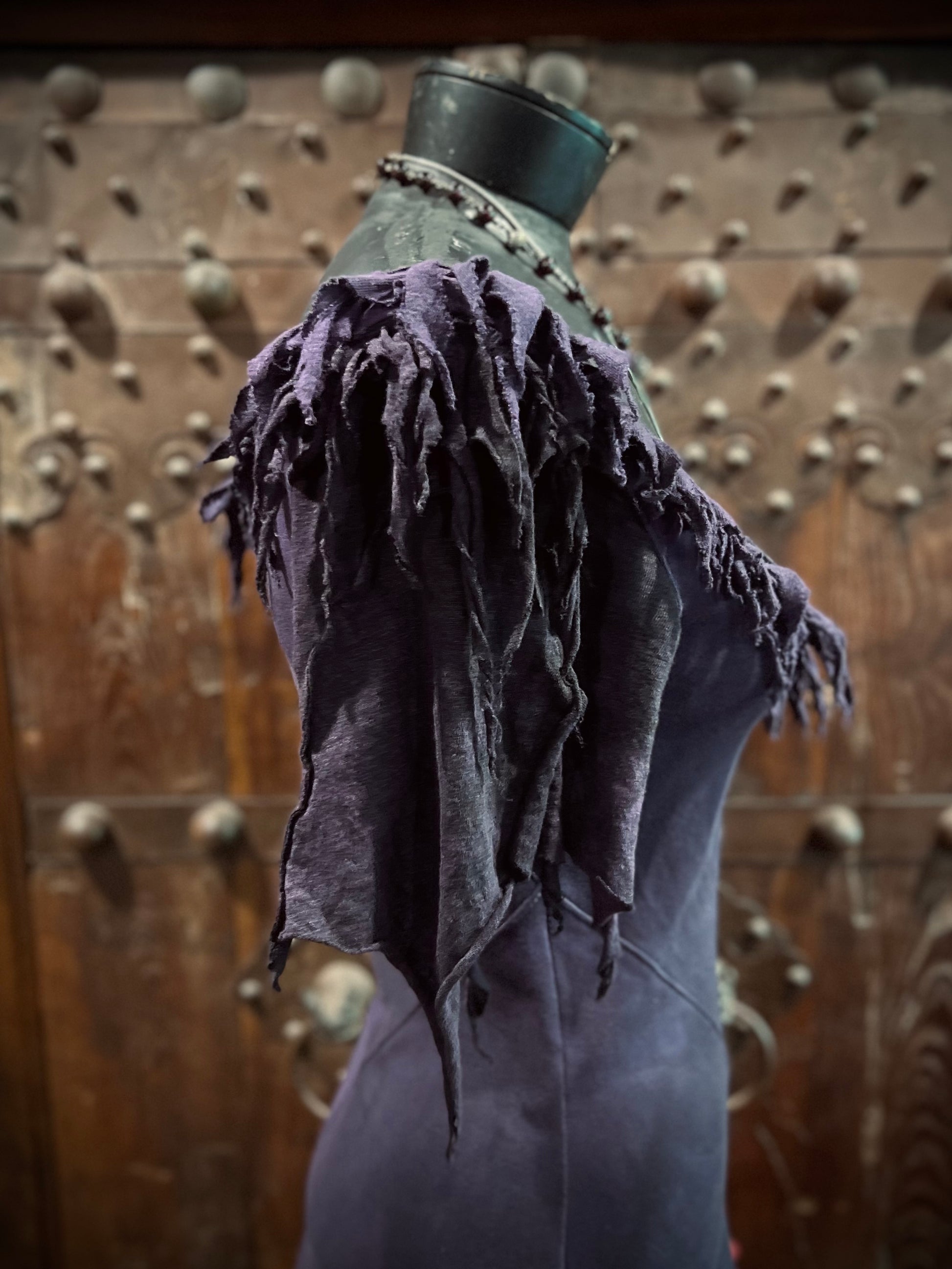 This dress is the epitome of gothic whimsy. The organic cotton/hemp stretch interlock body has cathedral like seams and a close hugging fit. The neckline has dozens of hand cut, individually added pieces of gathered fabric, with even more layered on the sleeves for an extra frayed look. The witchy sleeves are made from linen knit and add even more desheveled drama. Multi layered skirt mad from Linen knit and organic cotton/hemp jersey.