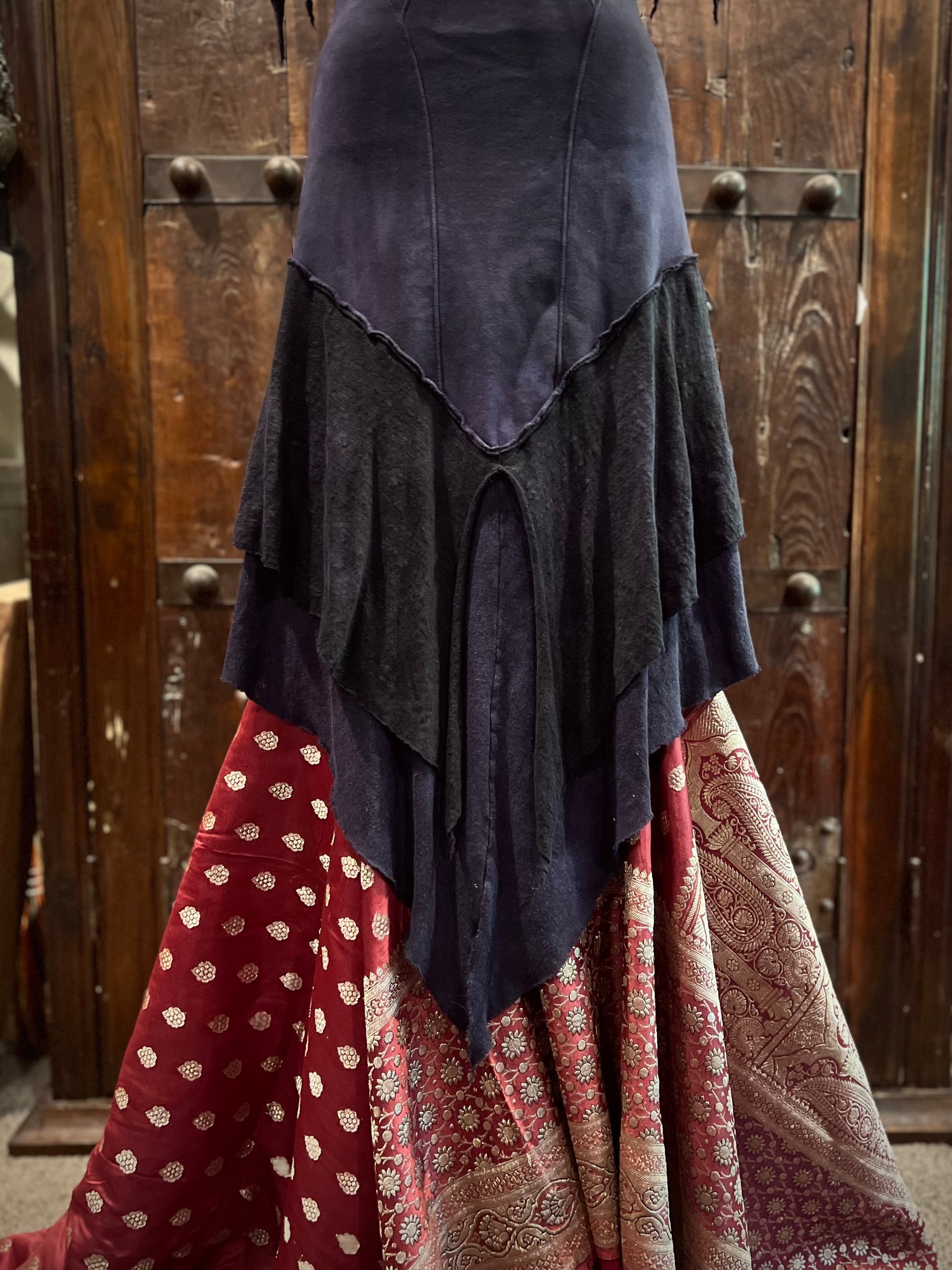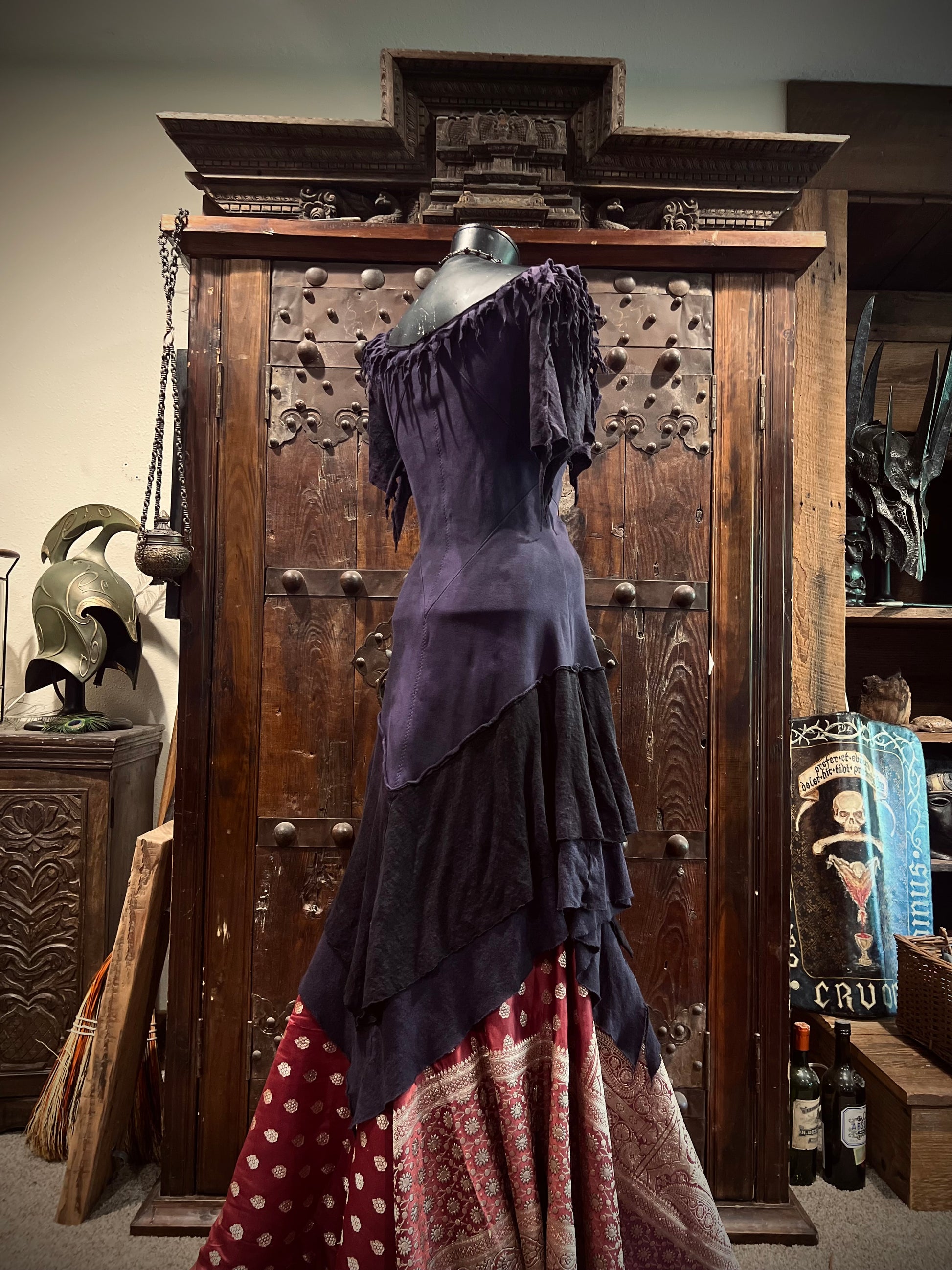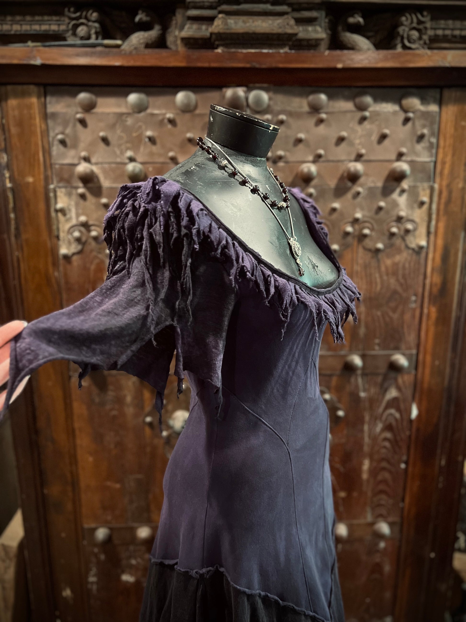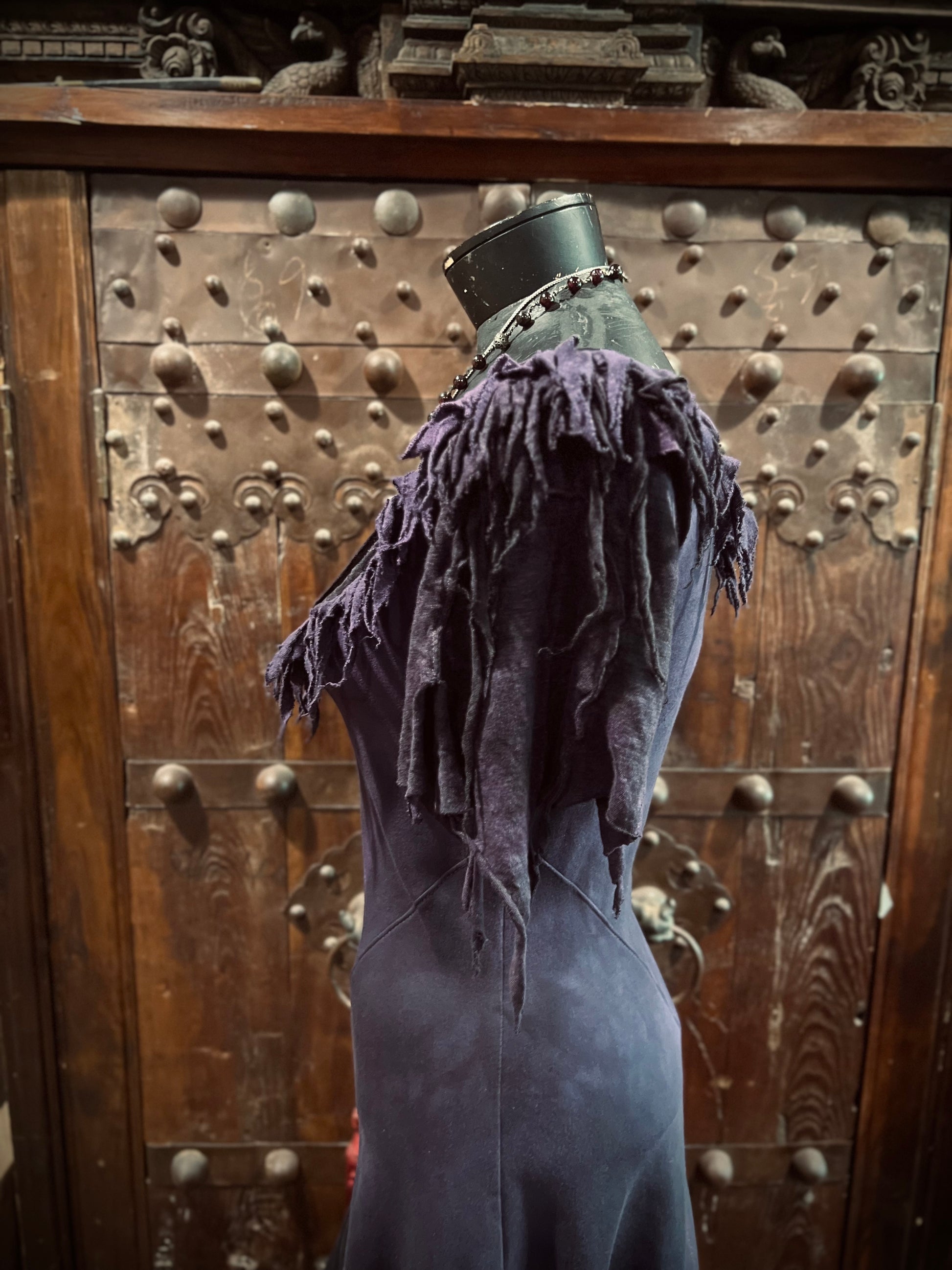 This dress is the epitome of gothic whimsy. The organic cotton/hemp stretch interlock body has cathedral like seams and a close hugging fit. The neckline has dozens of hand cut, individually added pieces of gathered fabric, with even more layered on the sleeves for an extra frayed look. The witchy sleeves are made from linen knit and add even more desheveled drama. Multi layered skirt mad from Linen knit and organic cotton/hemp jersey.