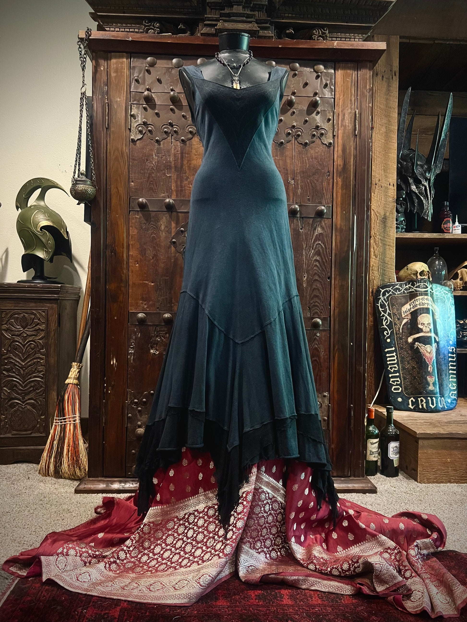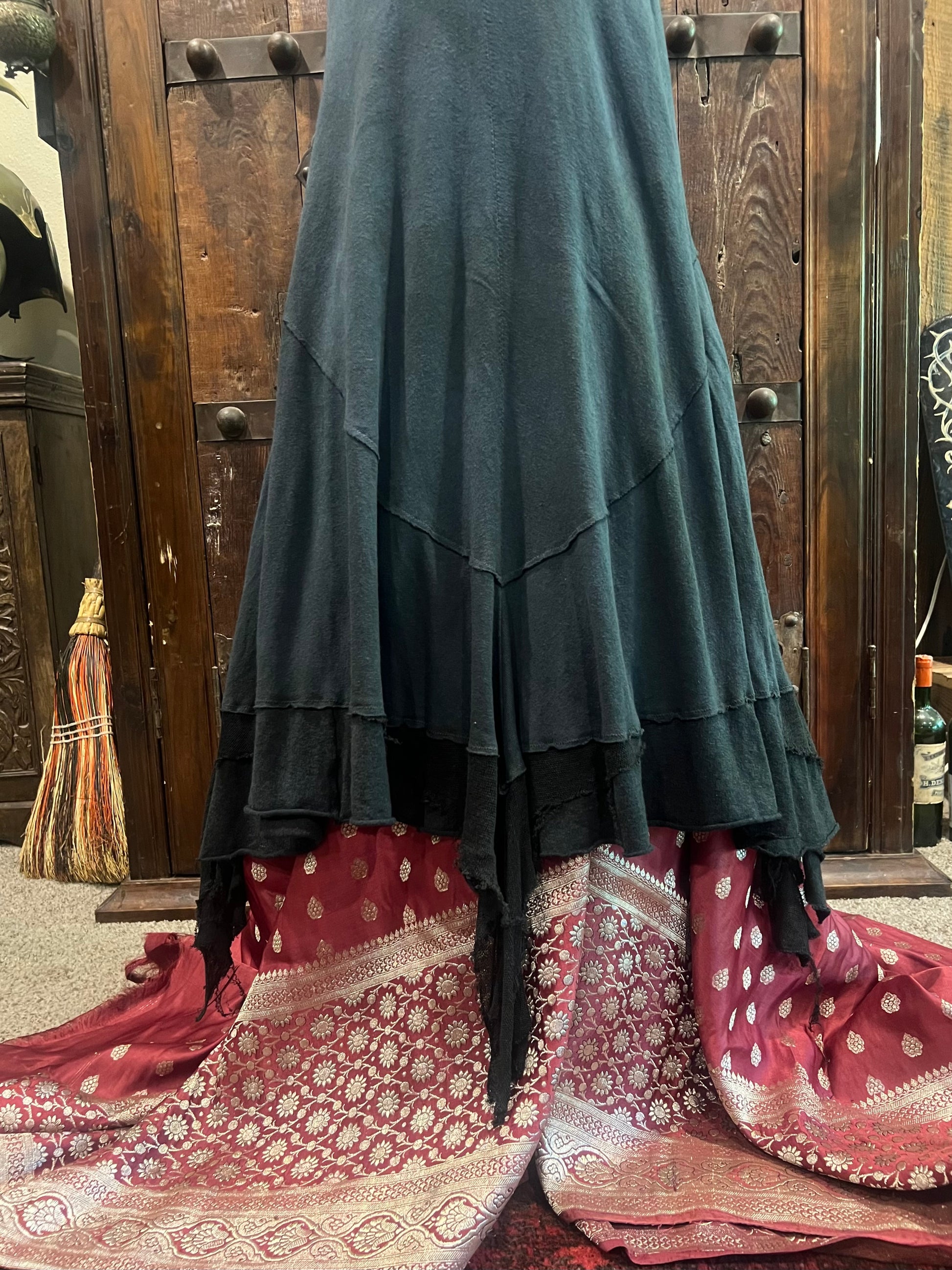 This beauty is truly OOAK, inspired by Annie's blue dress from the film Sinners. Cut on the bias and made from a medium weight linen knit. The fit is closely curve hugging yet very flexible and will flatter a range of sizes. Faced neckline with subtle, Elven like embroidery. So much going on with the hem! Made of a hemp/bamboo layered with a lightweight linen knit that gives a dripping, frayed effect. Hand dyed the most sumptuous deep stormy ocean blue.
